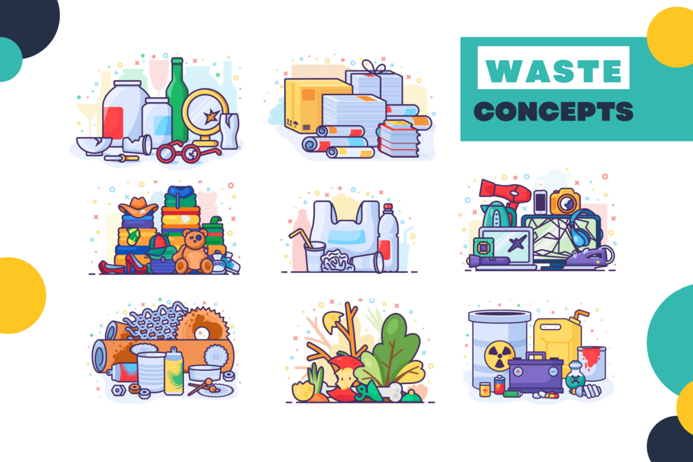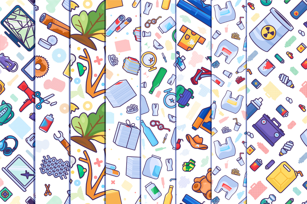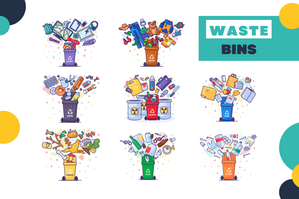 Waste Sorting Pack includes 210 stylish graphics about metal, hazardous, electronic, organic, plastic, paper, glass, and textile trash: icon sets, concepts, bins, recycling codes, and seamless patterns in EPS, JPG, PNG and SVG file formats.